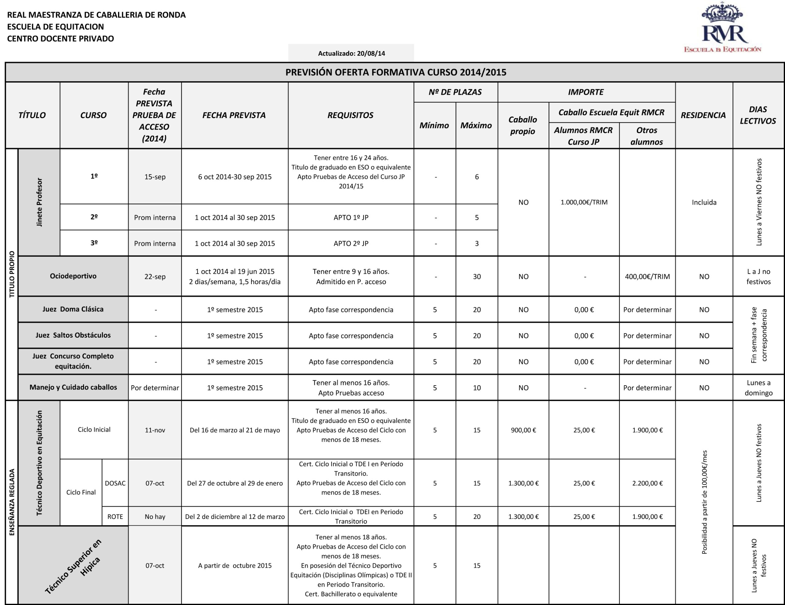 El fin de semana del 6 al 8 de marzo de 2015 se celebró en las instalaciones de la Escuela de Equitación de la Real Maestranza de Caballería de Ronda (RMR) el Curso de Juez Territorial de Doma Clásica coordinado por la Federación Andaluza de Hípica (FAH).