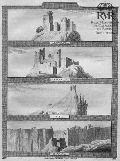 La h. de lám.: “M.A. Rooker delint. et sculpt.” representa los castillos de Alcobaça (Portugal), Almansa y Sax, y una vista de Ronda con el Puente Nuevo en proceso de construcción.
