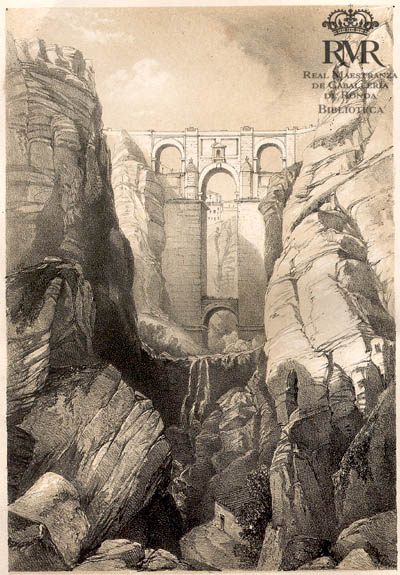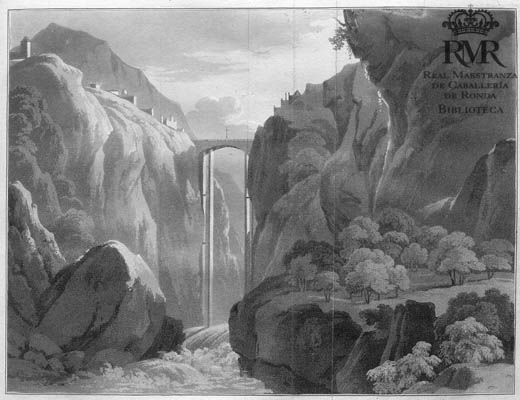 La h. de lám., sin mención de responsabilidad, representa una vista de Ronda con una imagen idealizada del Puente Nuevo.