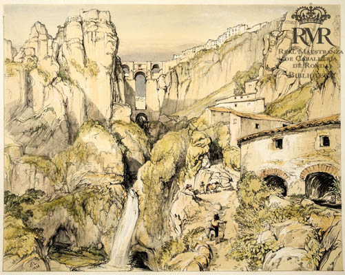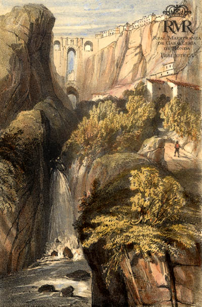 La h. de lám.: “J.F.L. 1833” representa una vista de Ronda y el Puente Nuevo desde Los Molinos.