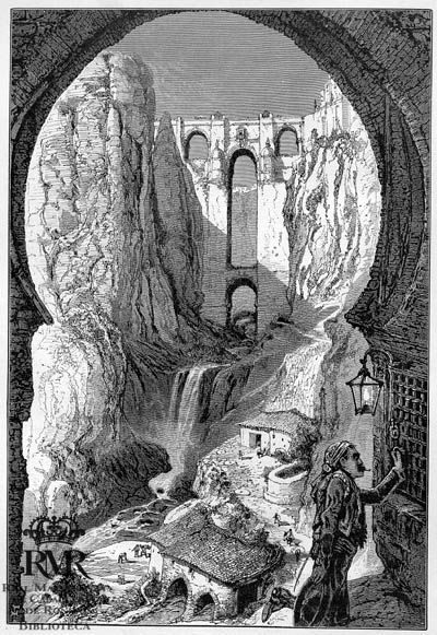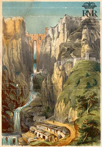 La h. de lám., sin mención de responsabilidad, representa una vista de Ronda y el Puente Nuevo desde Los Molinos.