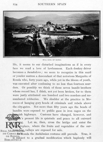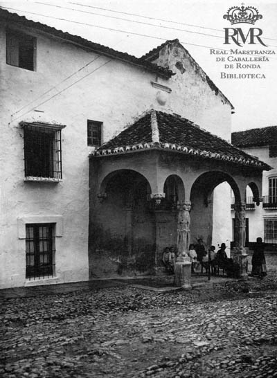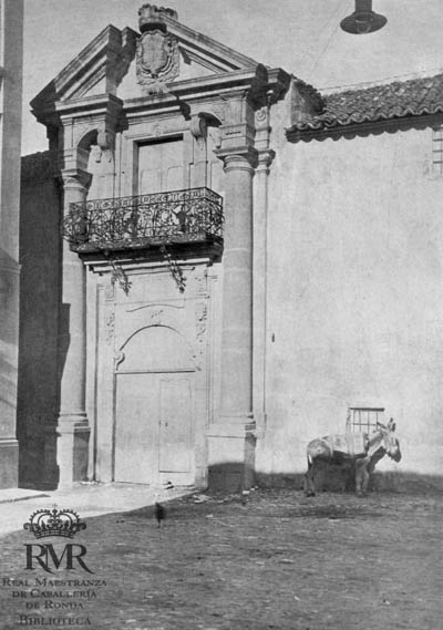 «Baroque entrance to the old bull ring, Ronda. The graceful iron balcony is ornamented with symbols of the national sport»