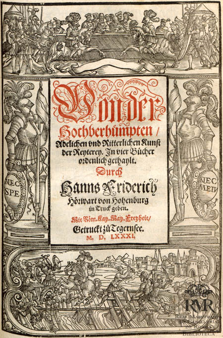 Portada del libro de Hanns Friderich Hörwart von Hohenburg titulado «Von der hochberhümpten, adelichen und ritterlichen kunst der reyterey» [Sobre el arte de la equitación, un arte muy estimado, noble y caballeresco], publicado en la imprenta del monasterio alemán de Tegernsee en 1581.